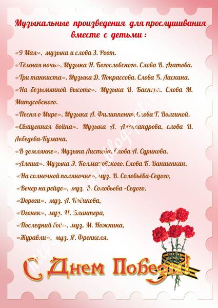 Советы музыкального руководителя -" Музыкальные произведения для прослушивания вместе с детьми " ко Дню Победы"