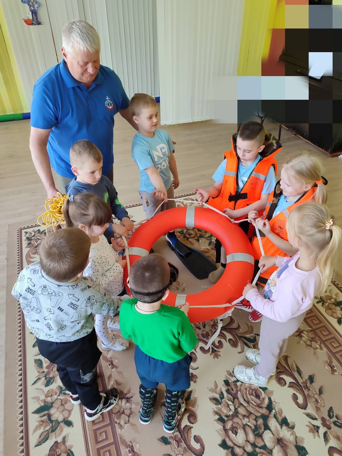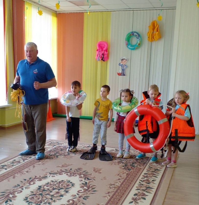 На развлечение прибыли не только гости подводного царства, но и председатель Толочинской районной организации ОСВОД , который рассказал детям о своей профессии, о команде спасателей, о правилах безопасности и поведении на воде. Также рассказал и показал воспитанникам способы и предметы для спасения: ласты спасательные круги и жилеты. Дети охотно примеряли и чувствовали себя настоящими спасателями.
