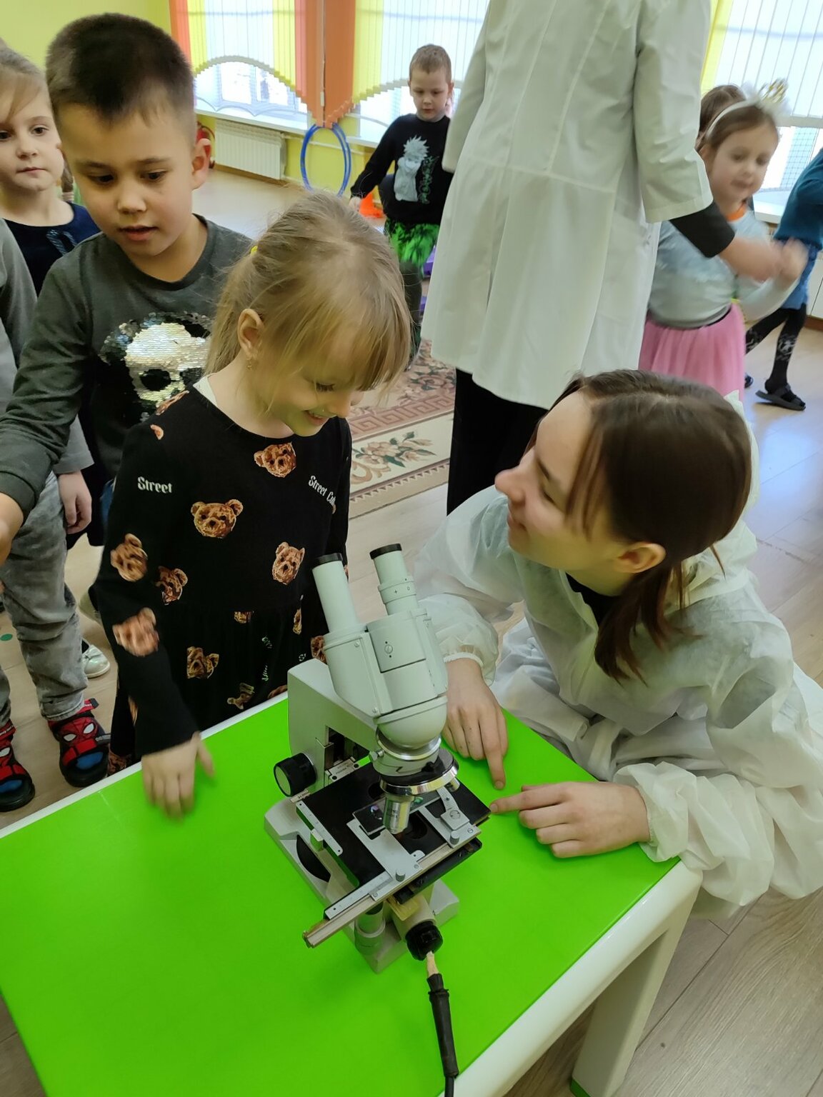 Интересно для ребят было рассматривание микробов под микроскопом и переодевание в санэпидемиолога