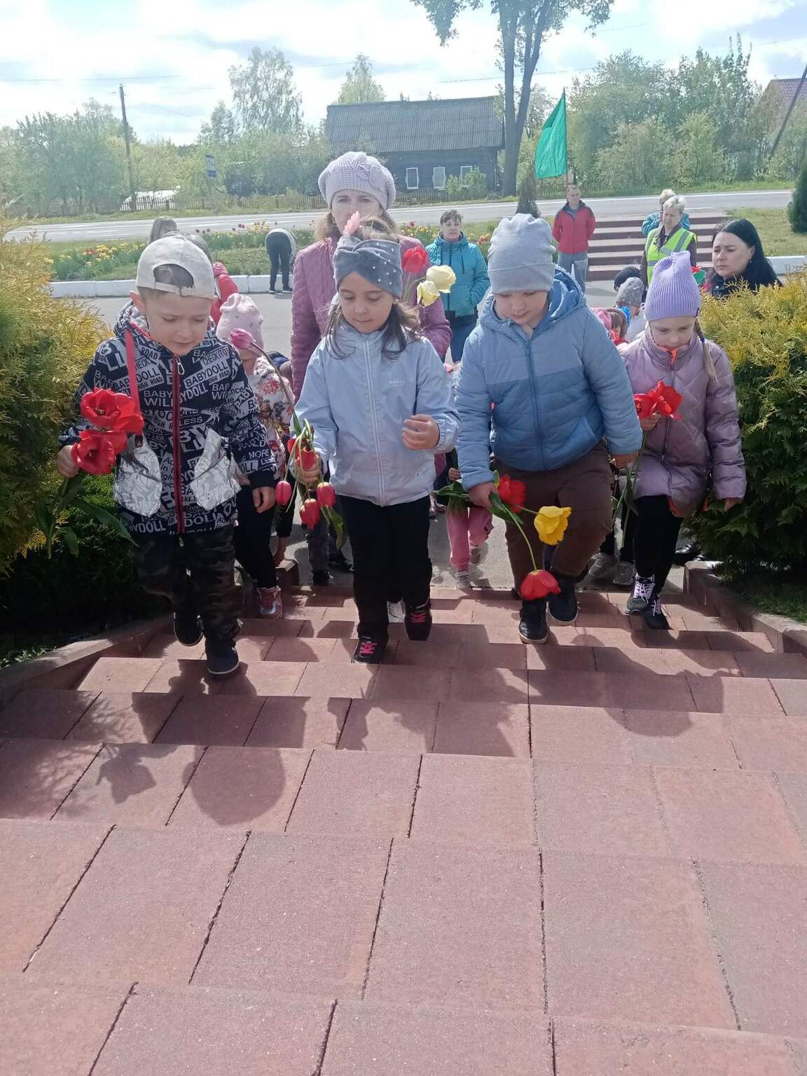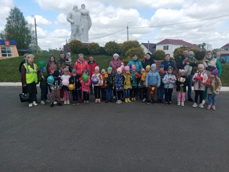 А  затем ребята, вместе со своими родителями  и работниками детского сада  под звуки военных песен  совершили пешеходную экскурсию  к памятнику  " Освобождение", где  возложили цветы и почтили память погибших минутой молчания.