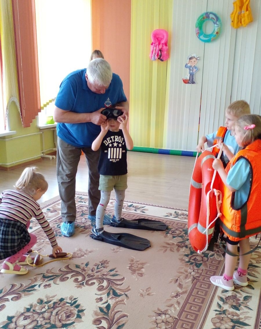 На развлечение прибыли не только гости подводного царства, но и председатель Толочинской районной организации ОСВОД , который рассказал детям о своей профессии, о команде спасателей, о правилах безопасности и поведении на воде. Также рассказал и показал воспитанникам способы и предметы для спасения: ласты спасательные круги и жилеты. Дети охотно примеряли и чувствовали себя настоящими спасателями.