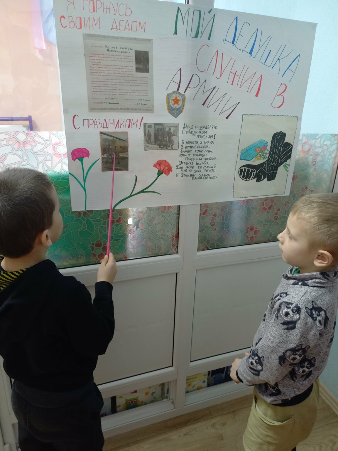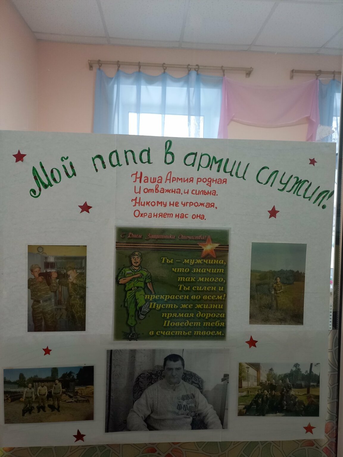Во всех возрастных группах прошли различные мероприятия: чтение художественной литературы, беседы, игры, рассматривание иллюстраций по теме,  отгадывание загадок о военной технике, о разных родах войск, рисование, лепка по теме. С большим интересом воспитанники с помощью взрослых изготовили  подарки для любимых пап.