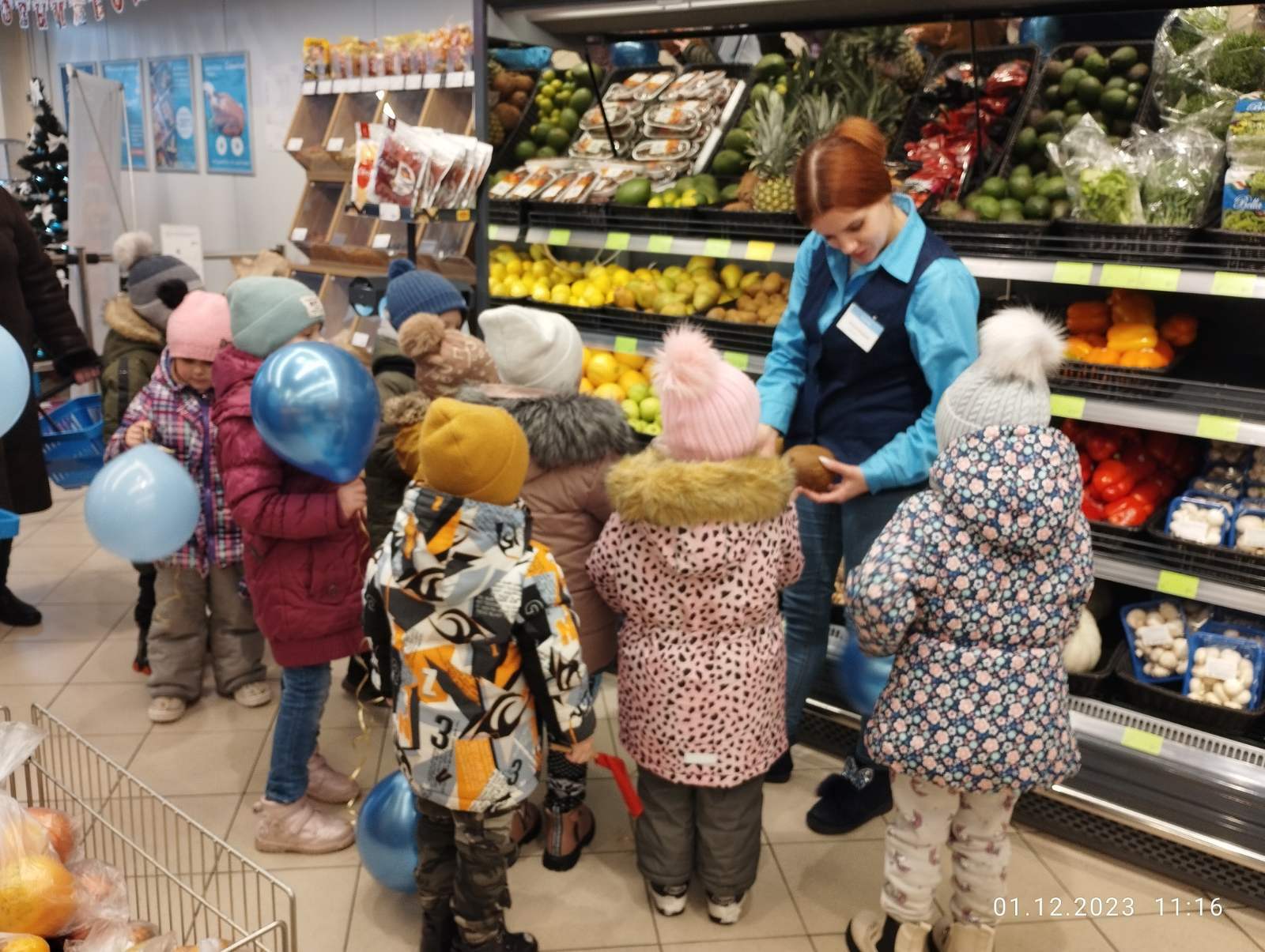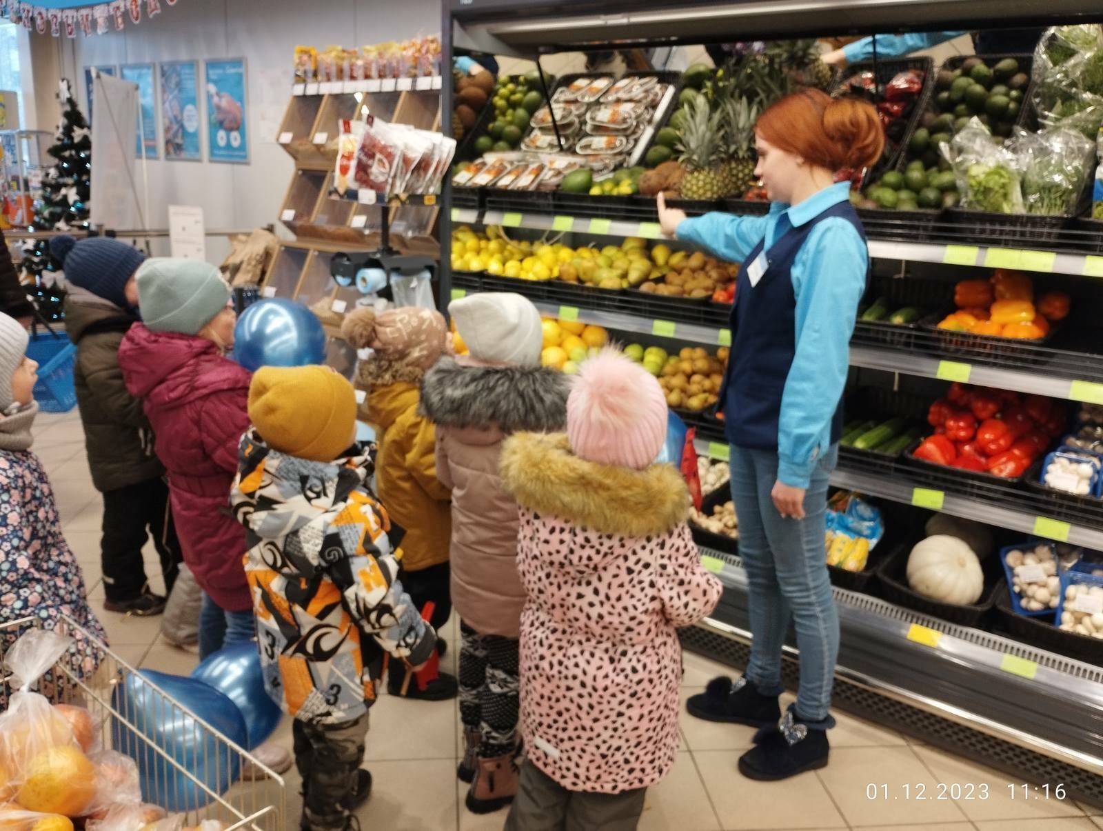 Перед входом в магазин дети  обратили внимание на здание, вывеску магазина, вспомнили правила поведения, а затем ребят встретила доброжелательный продавец, которая предложила вместе отправиться на прогулку по отделам магазина.