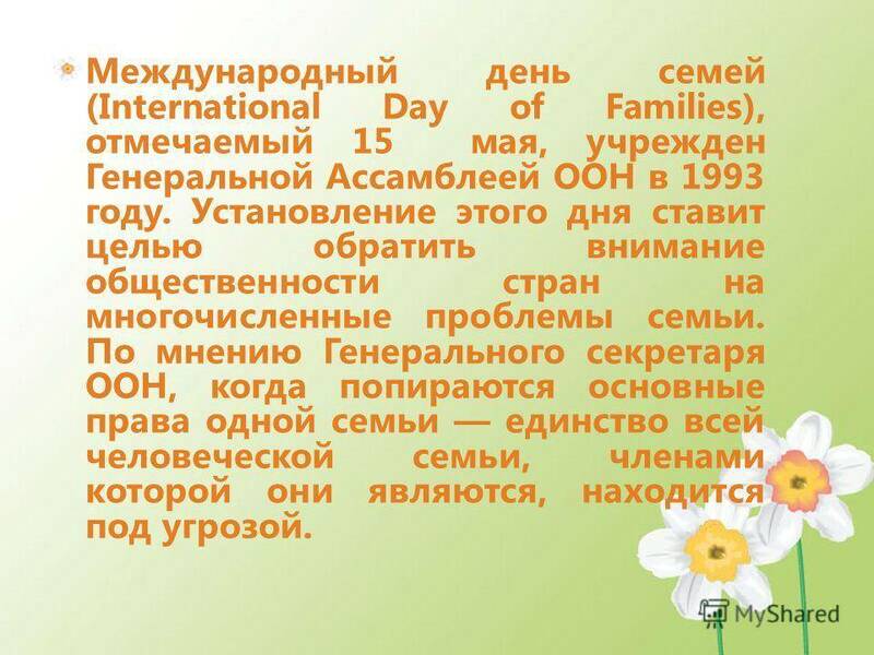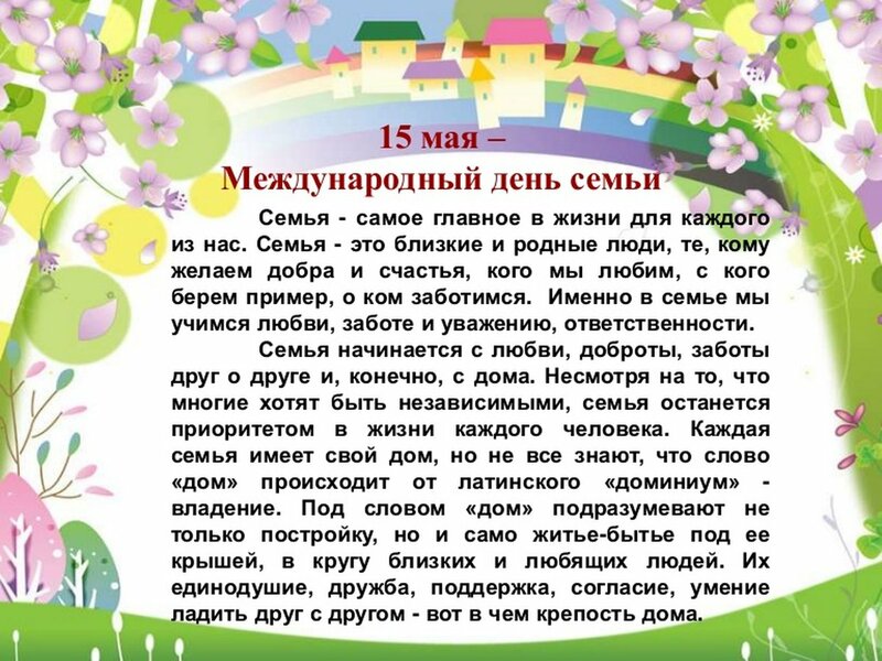День семьи – важный праздник, который      празднуется  не только  в нашей стране,     но и во всём мире. Это один из самых     светлых праздников, который имеет         отношение к каждому человеку, так как с     семьи начинается жизнь человека.
