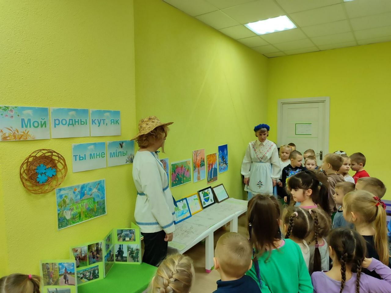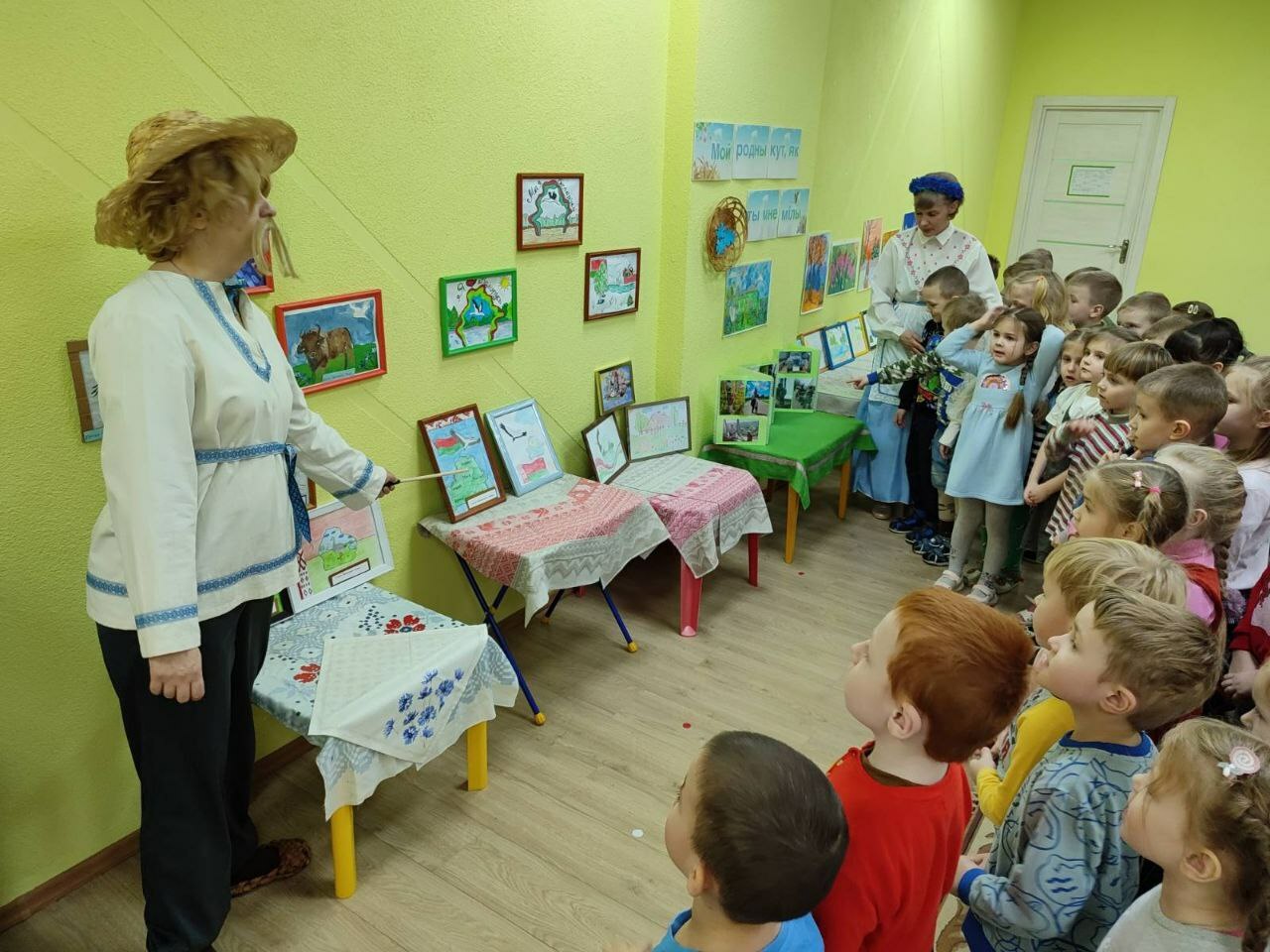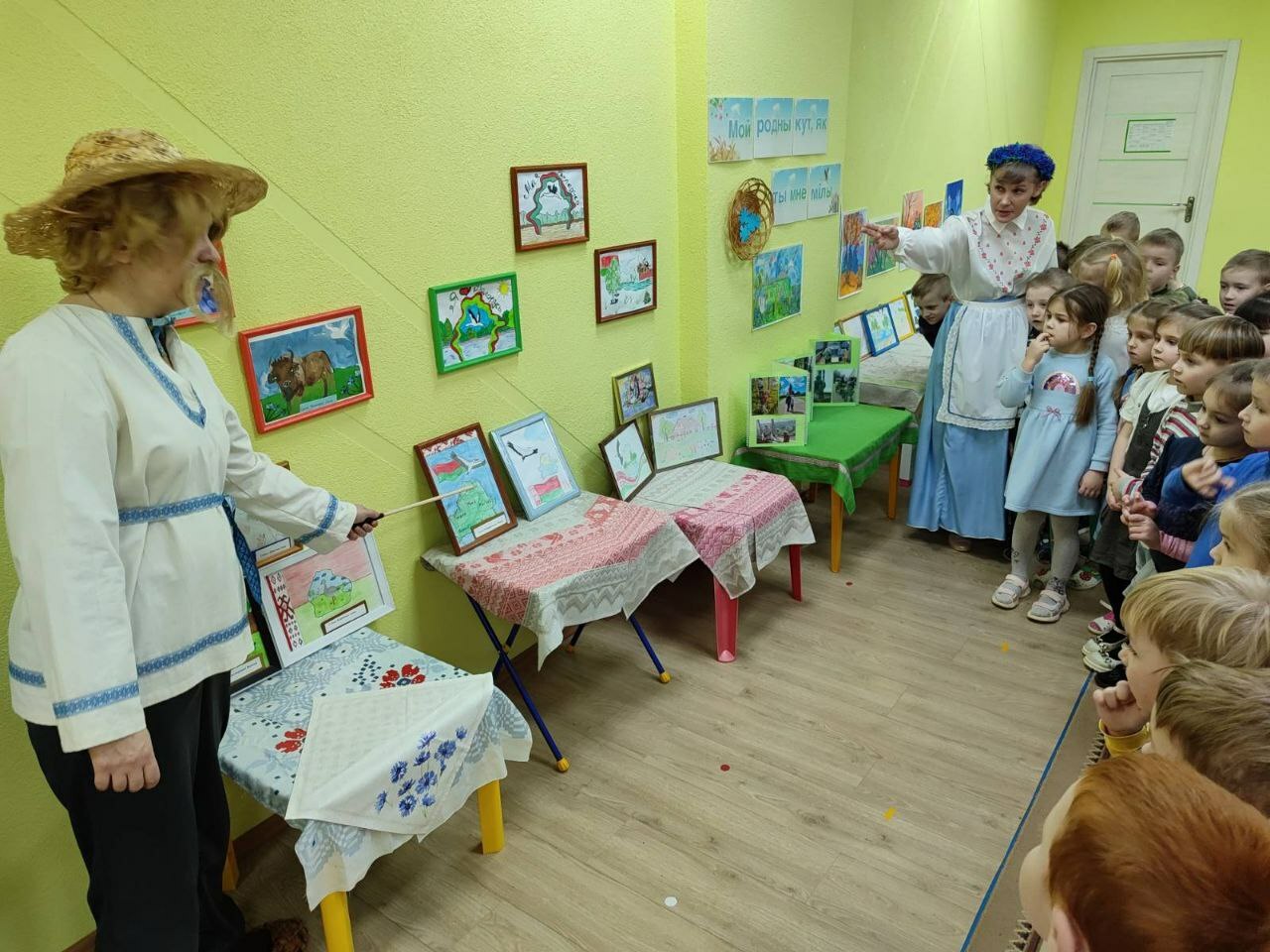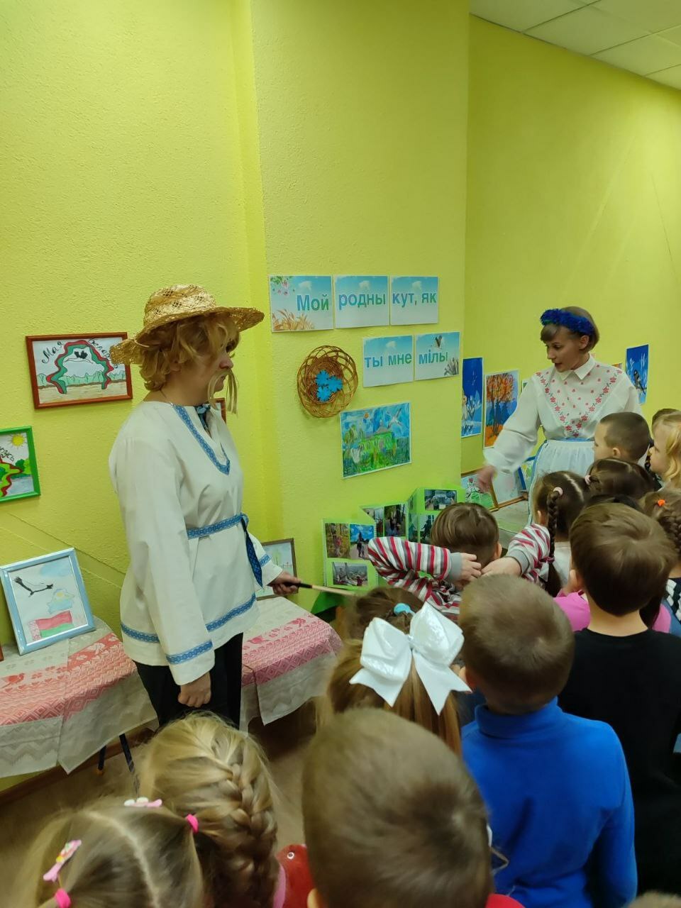 а пригласили детей на выставку любознательные и веселые Янка и Аринка, которые провели с ребятами  викторину «Моя страна -Беларусь и я этим горжусь», поиграли в белорусские народные игры «Шэры кот», «Лапці», «Гарлачык»,мелодично исполнили белорус-ские песни,станцевали «Польку белорус-скую»,«Лявониху».С вдохновением расска-зывали о своих творческих работах и с кем они создавались, вспомнили о жанрах и видах изобразительного искусства, активно делились впечатлениями со сверстниками и другими участниками мероприятия.