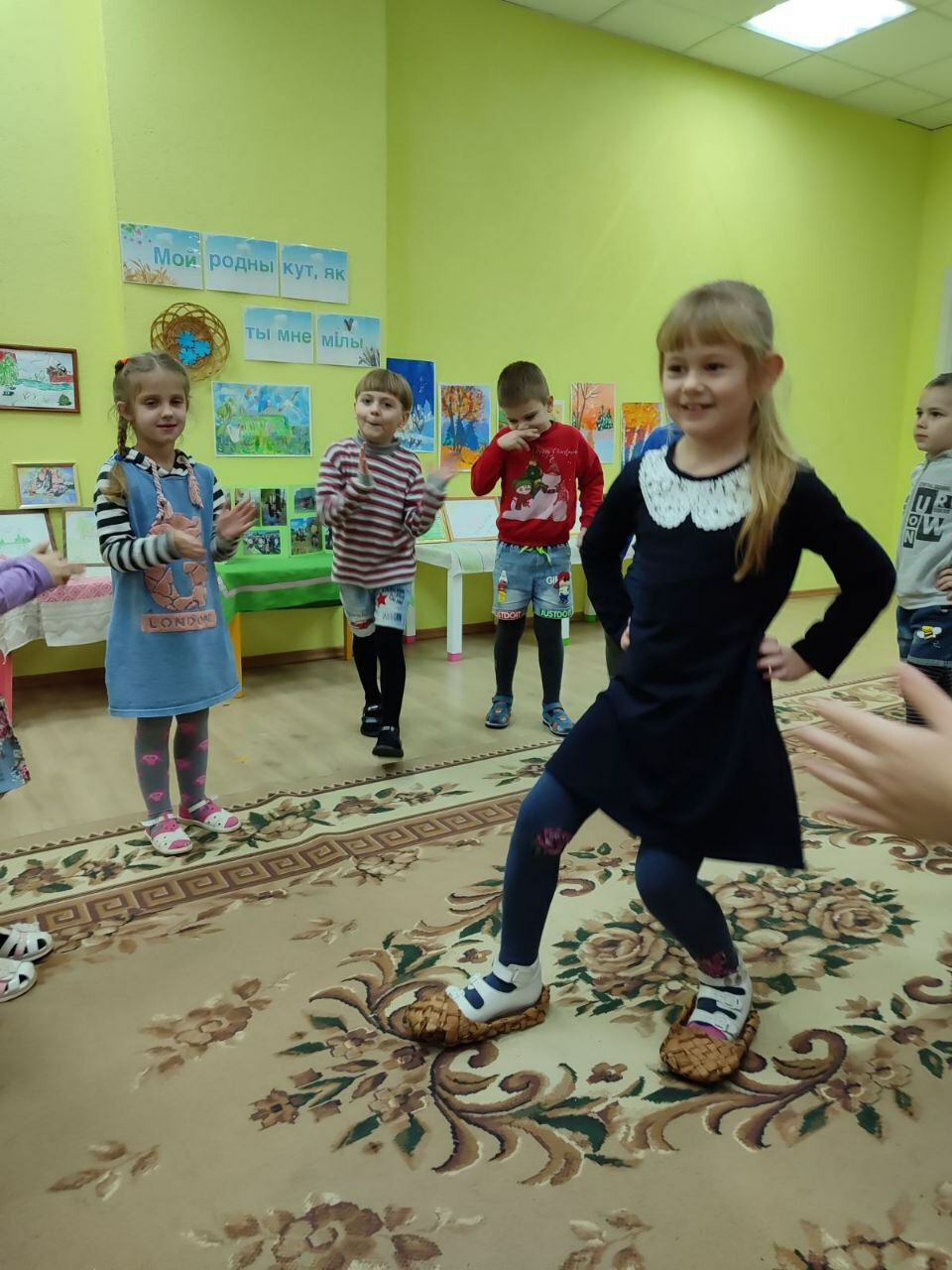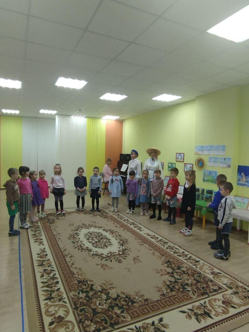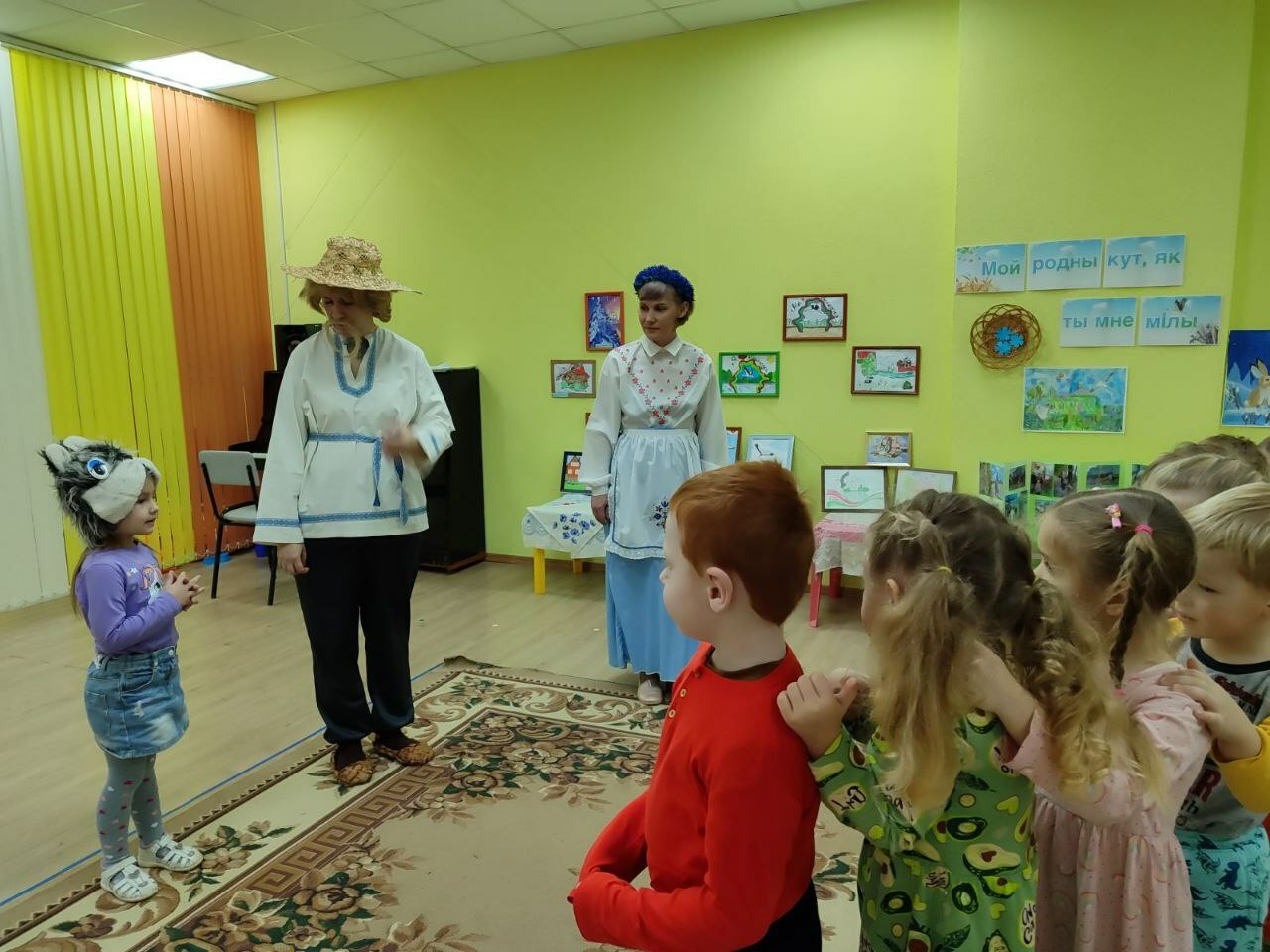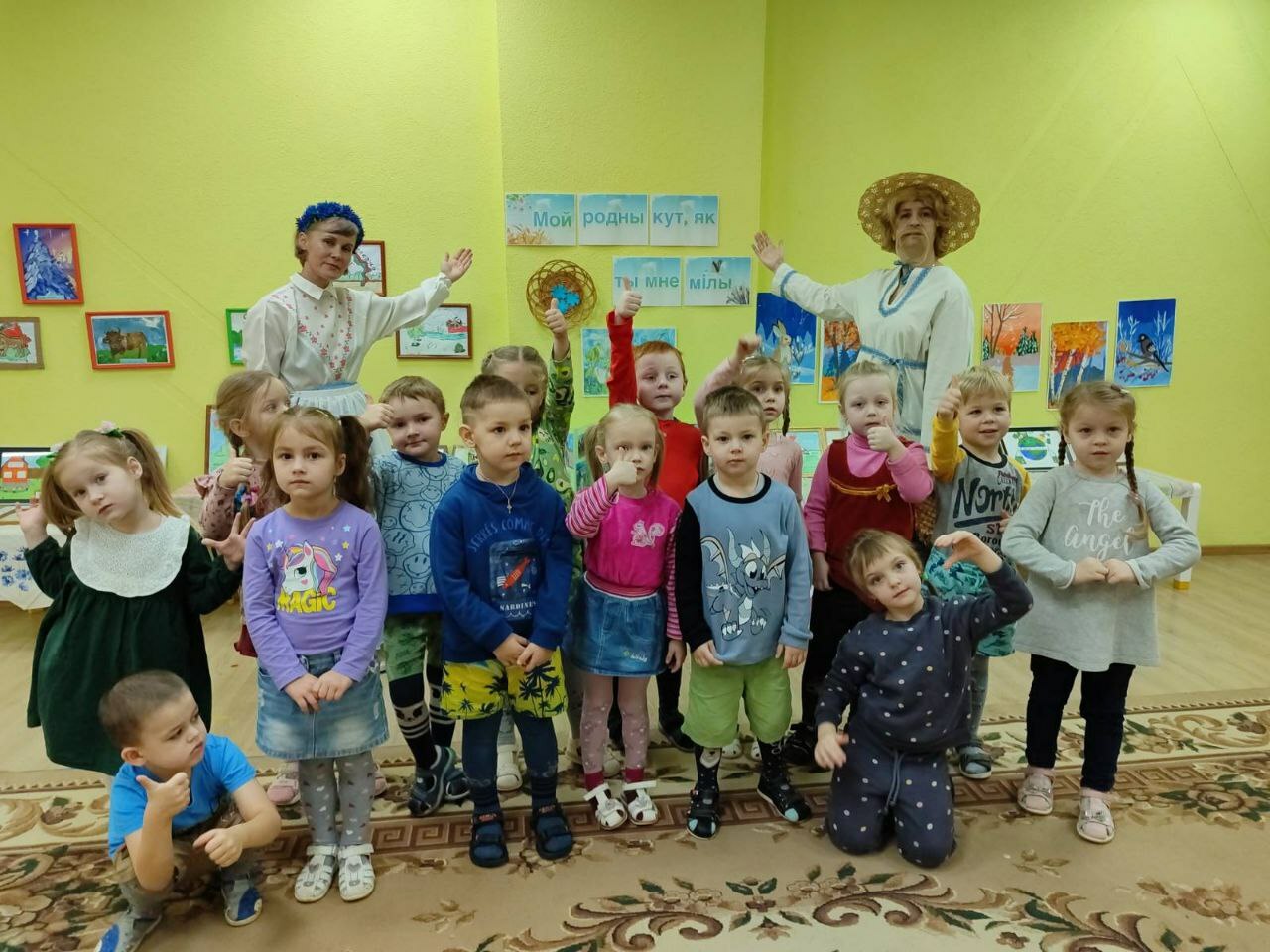Сення, 21 лютага, у другіх малодшых групах хлопцы гулялі ў дыдактычныя гульні "Знаемства з беларускай цацкай", "Знайдзі пару", "з чаго зроблены вырабы", "Назаві па-беларуску", наведалі ТЭАТР ,дзе сталі ўдзельнікамі драматызацыі беларускай казкі "Коцік, пеунік і лісіца". Выхаванцы сярэдніх груп наведалі выставу"і сёння з намі Колас і Купала".