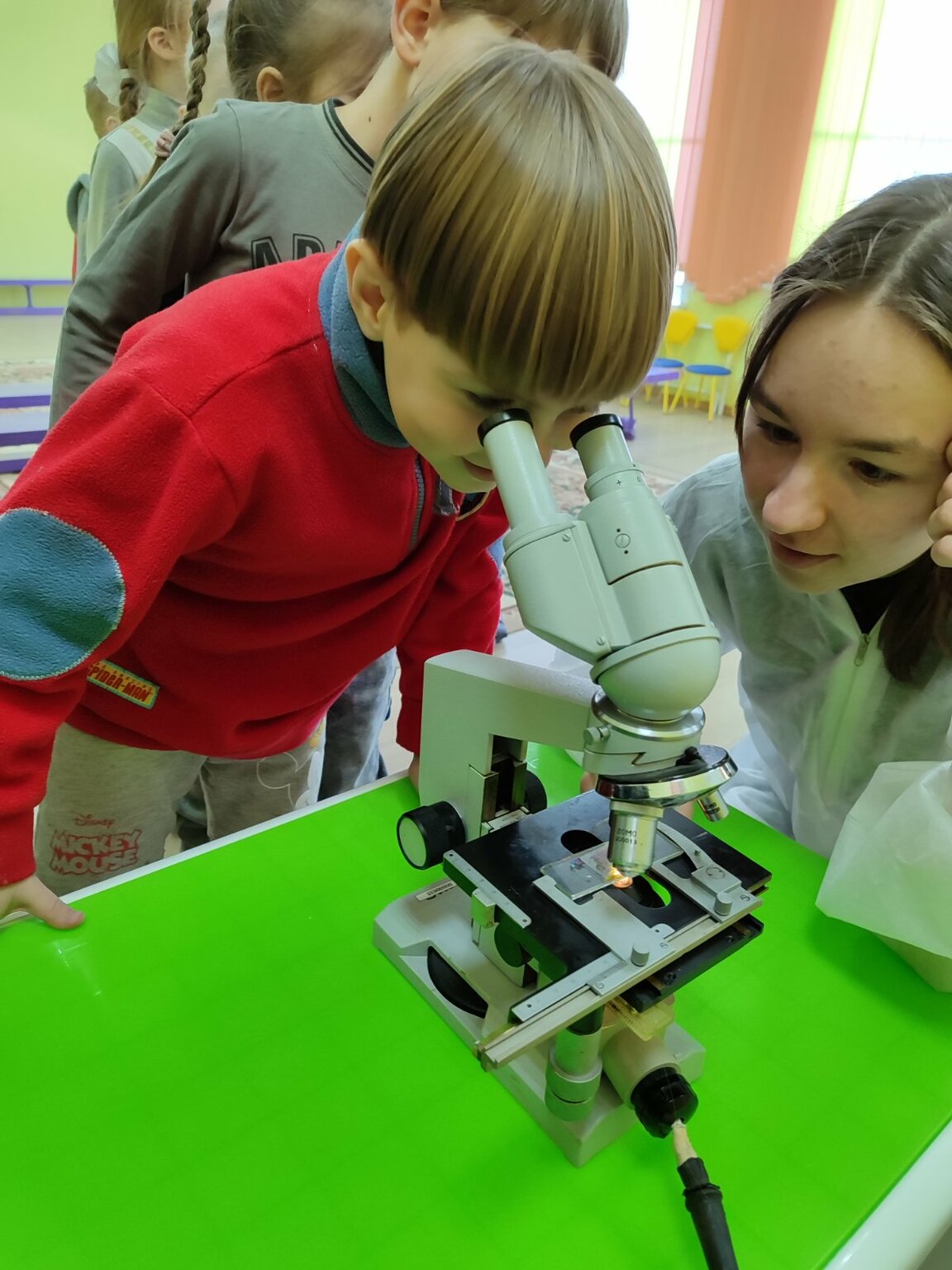 Интересно для ребят было  рассматривание микробов под микроскопом и переодевание в санэпидемиолога