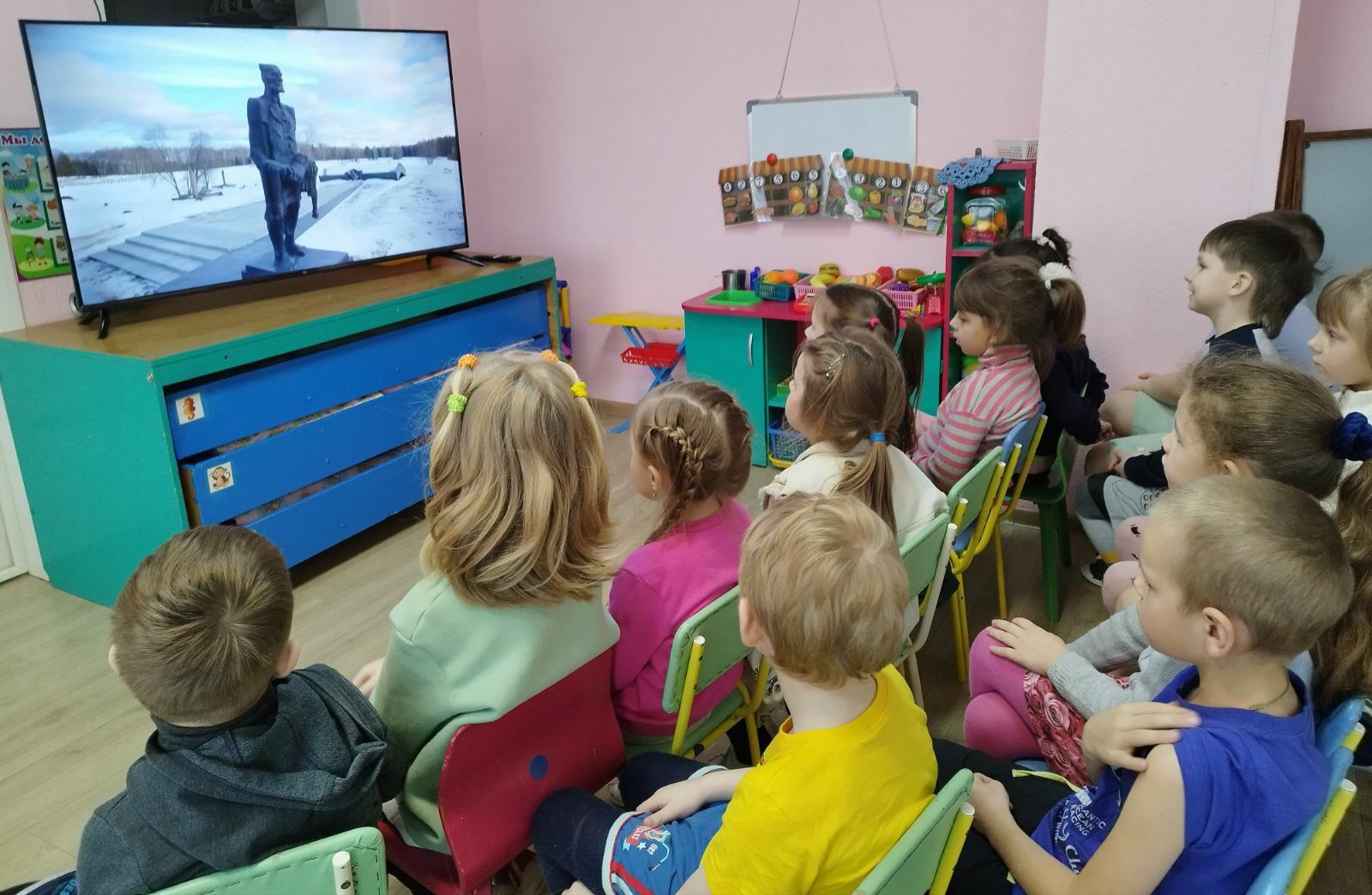 А затем ребята, вместе со своими родителями и работниками детского сада под звуки военных песен совершили пешеходную экскурсию к памятнику " Освобождение", где возложили цветы и почтили память погибших минутой молчания.