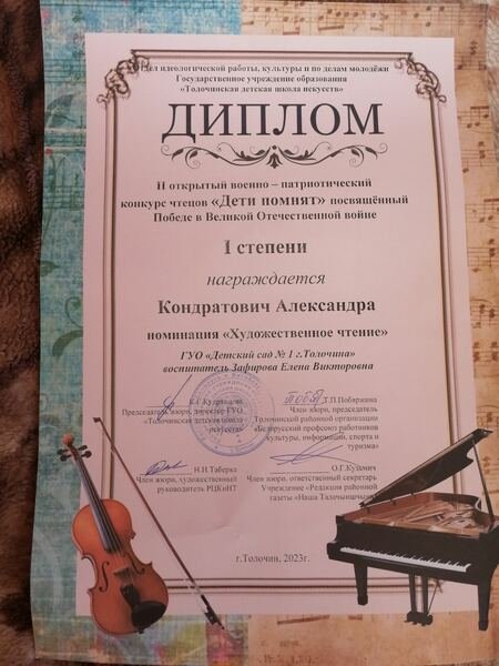 Воспитанники старшей группы учреждения приняли участие в открытом военно-патриотическом конкурсе чтецов " Дети помнят" , посвящённом Победе в Великой отечественной войне, который проходил в Государственном учреждении образования " Толочинсская детская школа искусств."