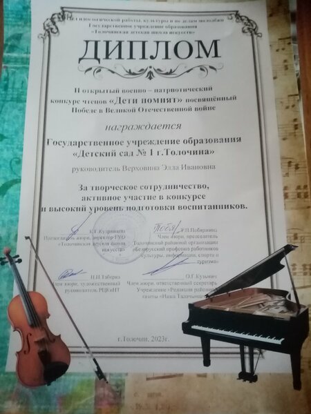 Дипломом награждён воспитатель дошкольного образования группы и учреждение образования за творческое сотрудничество , активное участие в конкурсе и высокий уровень подготовки воспитнников.