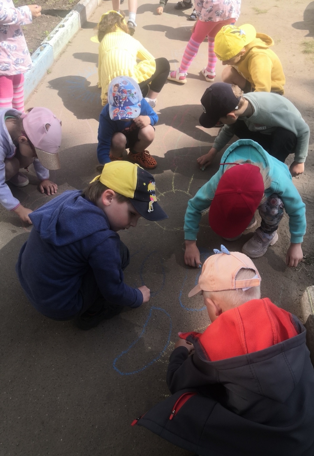 Но как же праздник без ярких красок? А тут постарались ребята из младших групп, которые на асфальте при помощи разноцветных мелков нарисовали "Праздничные шары".
