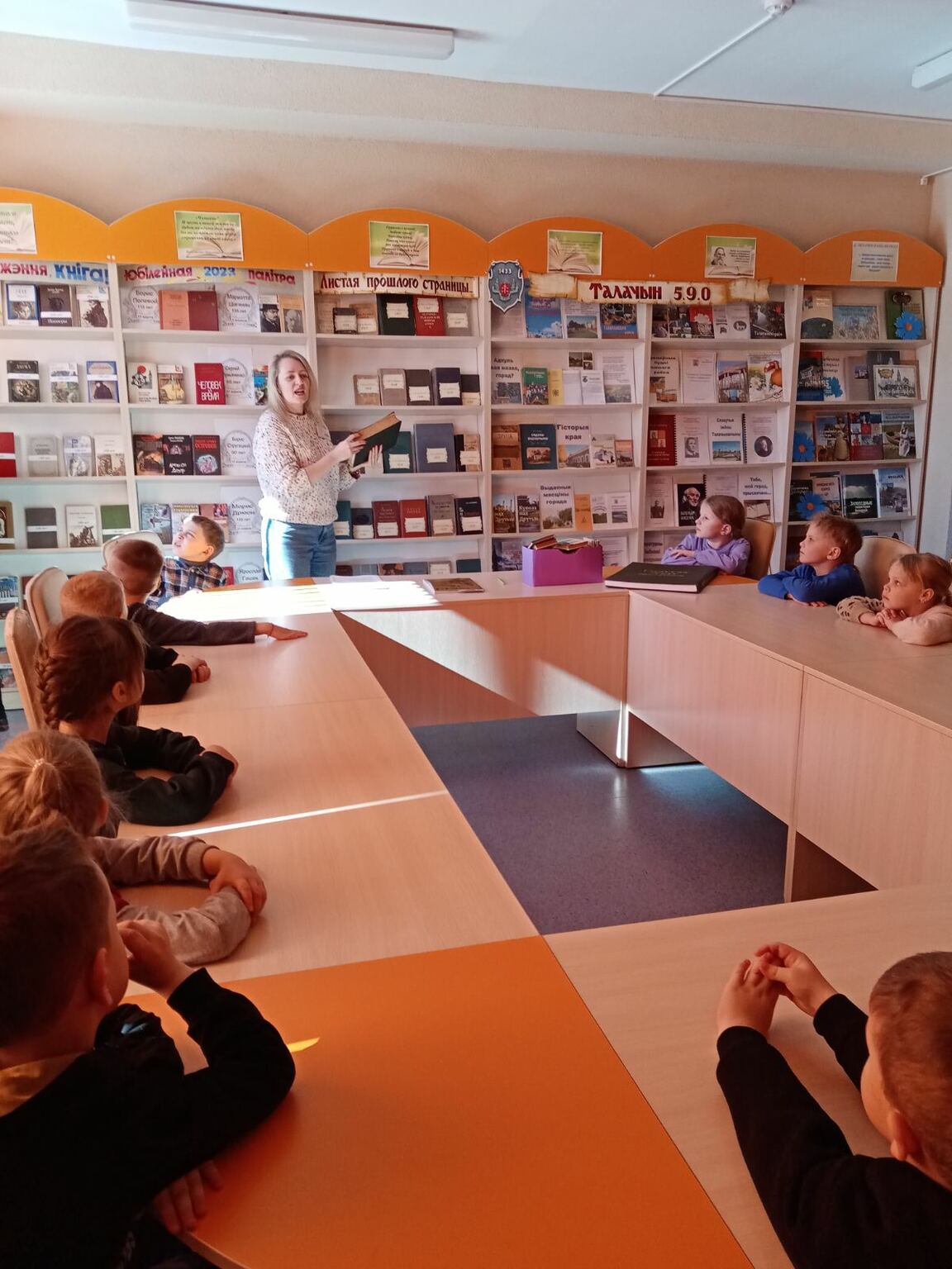 Ребята посетили читальный зал, книгохранилище, узнали, что у каждой книги есть свое место. Работники библиотеки познакомили и рассказали ребятам о выставках «Беларусь – мiрная i стваральная краiна», «Беларусь и Россия – строим будущее вместе».